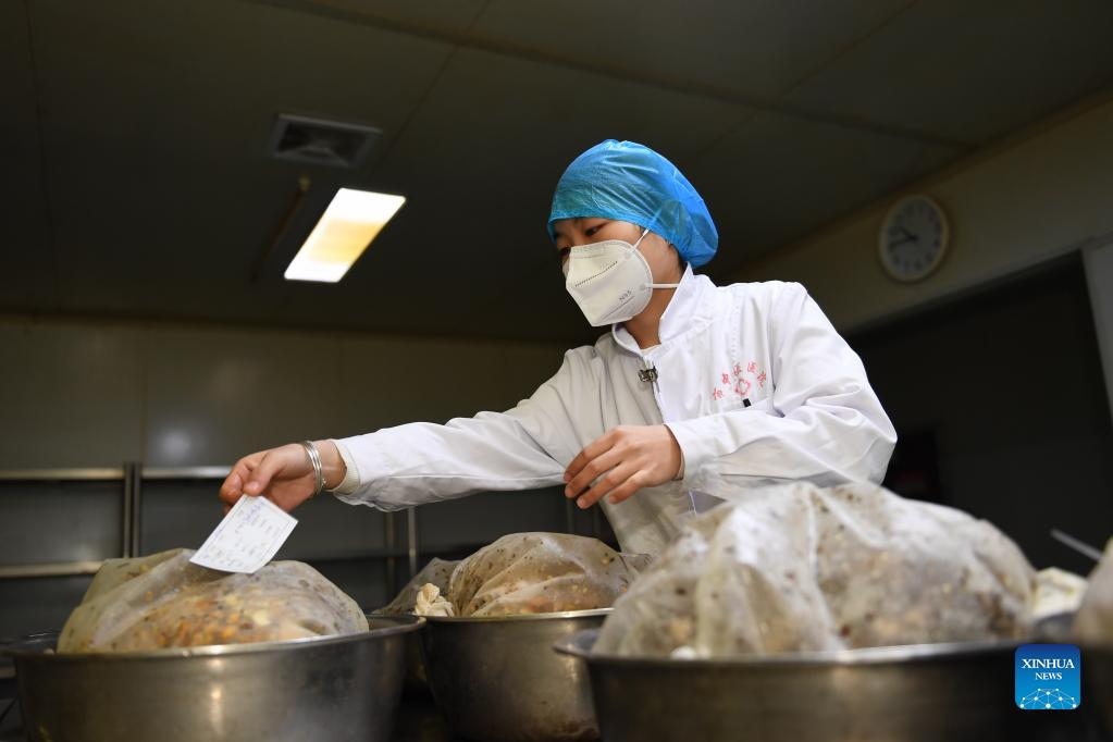 A pharmacist immerses traditional Chinese medicine (TCM) decoctions at Xi'an TCM hospital in Xi'an, northwest China's Shaanxi Province, Jan. 3, 2022. The hospital has been providing TCM decoctions to individuals under medical quarantine and medical workers at the frontline to help control the recent spike in COVID-19 infections in Xi'an. (Xinhua/Li Yibo)