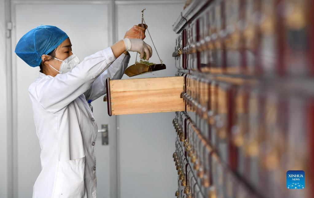 A pharmacist prepares ingredients to produce traditional Chinese medicine (TCM) decoctions at Xi'an TCM hospital in Xi'an, northwest China's Shaanxi Province, Jan. 3, 2022. The hospital has been providing TCM decoctions to individuals under medical quarantine and medical workers at the frontline to help control the recent spike in COVID-19 infections in Xi'an. (Xinhua/Li Yibo)