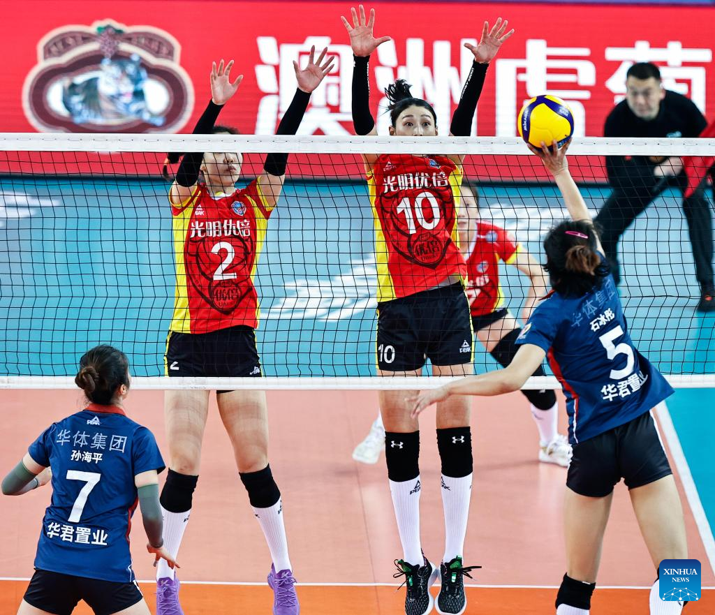 Kim Yeon Koung (top R) of Shanghai blocks the ball during the second leg of bronze medal match between Shanghai and Liaoning at the 2021-2022 season Chinese Women's Volleyball Super League in Jiangmen, south China's Guangdong Province, Jan. 4, 2022. (Xinhua/Yang Zhisen)