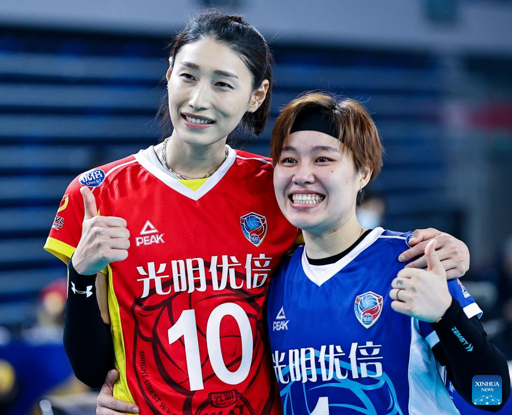 Kim Yeon Koung (L) of Shanghai celebrates with teammate Wang Weiyi after winning the second leg of bronze medal match between Shanghai and Liaoning at the 2021-2022 season Chinese Women's Volleyball Super League in Jiangmen, south China's Guangdong Province, Jan. 4, 2022. (Xinhua/Yang Zhisen)