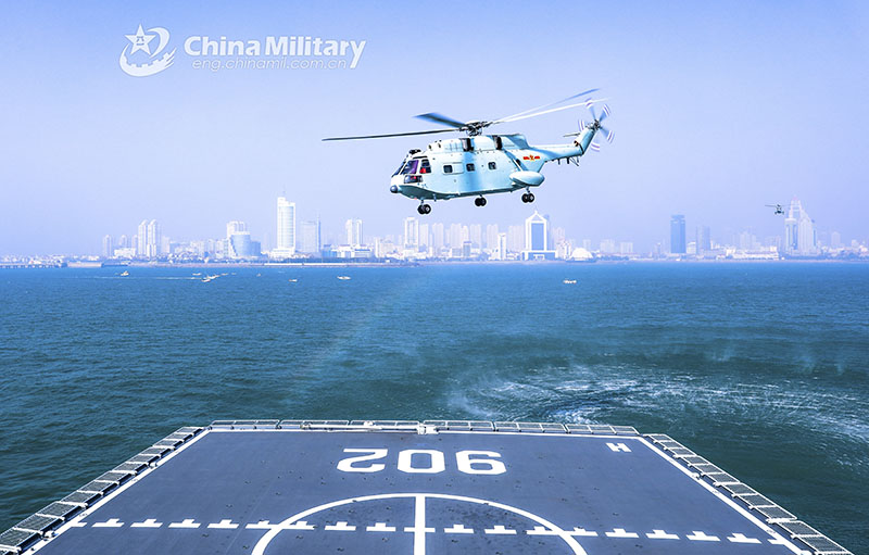 A ship-borne helicopter attached to a brigade under the PLA Navy’s marine corps lands on the flight deck of the comprehensive supply ship Dongpinghu (Hull 902) during a round-the-clock landing operation on December 17, 2021. (eng.chinamil.com.cn/Photo by Cong Lianying)