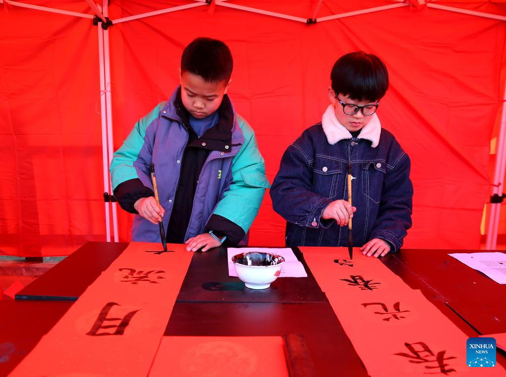 Children write couplets during the New Year holiday in Huai'an City, east China's Jiangsu Province, Jan. 1, 2022. (Photo by Chen Kai/Xinhua)