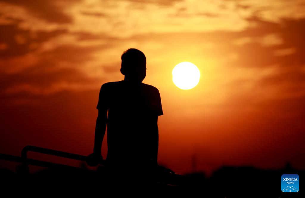 A man enjoys the last sunset of 2021 at Botahtaung harbor in Yangon, Myanmar, Dec. 31, 2021. (Xinhua/U Aung)
