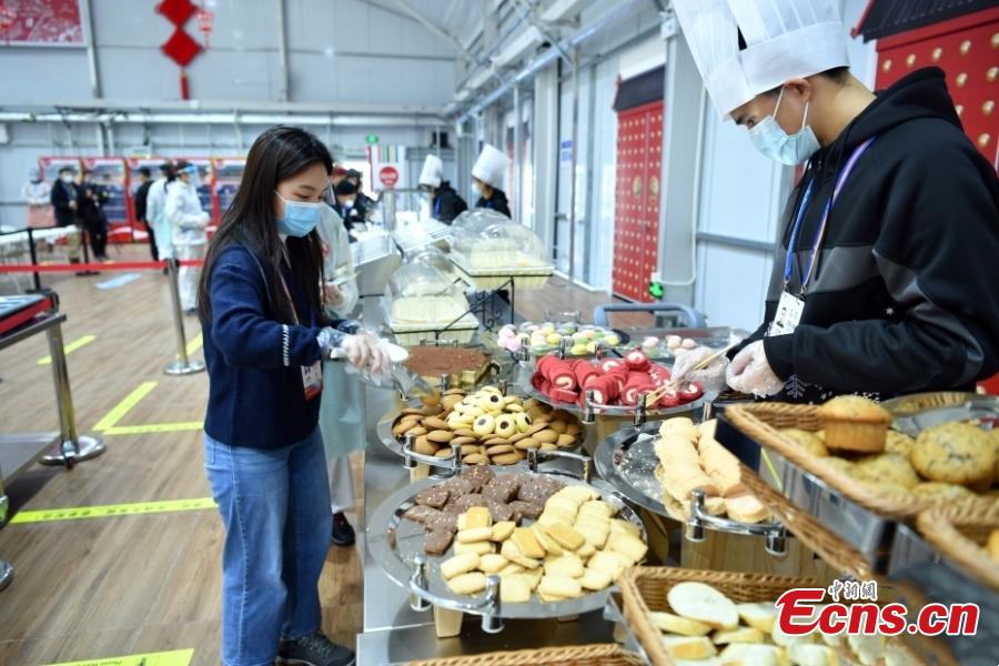 Participants of all-factor tests take a meal at the Beijing 2022 Winter Olympic and Paralympic Village at Zhangjiakou, north China‘’s Hebei Province. (Photo: China News Service/Zhai Yujia)