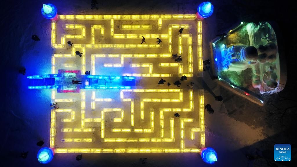 In this aerial photo, people visit the 48th Harbin ice lantern fair in Harbin, northeast China's Heilongjiang Province, Jan. 5, 2022. The ice lantern fair kicked off here on Wednesday. (Xinhua/Wang Jianwei)