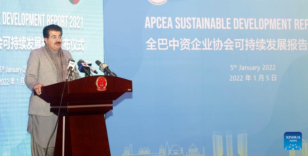 Chairman of Pakistan's senate Sadiq Sanjrani speaks at the launching ceremony of the "All-Pakistan Chinese Enterprises' Association (APCEA) Sustainable Development Report 2021" in Islamabad, capital of Pakistan, Jan. 5, 2022. (Xinhua/Ahmad Kamal)