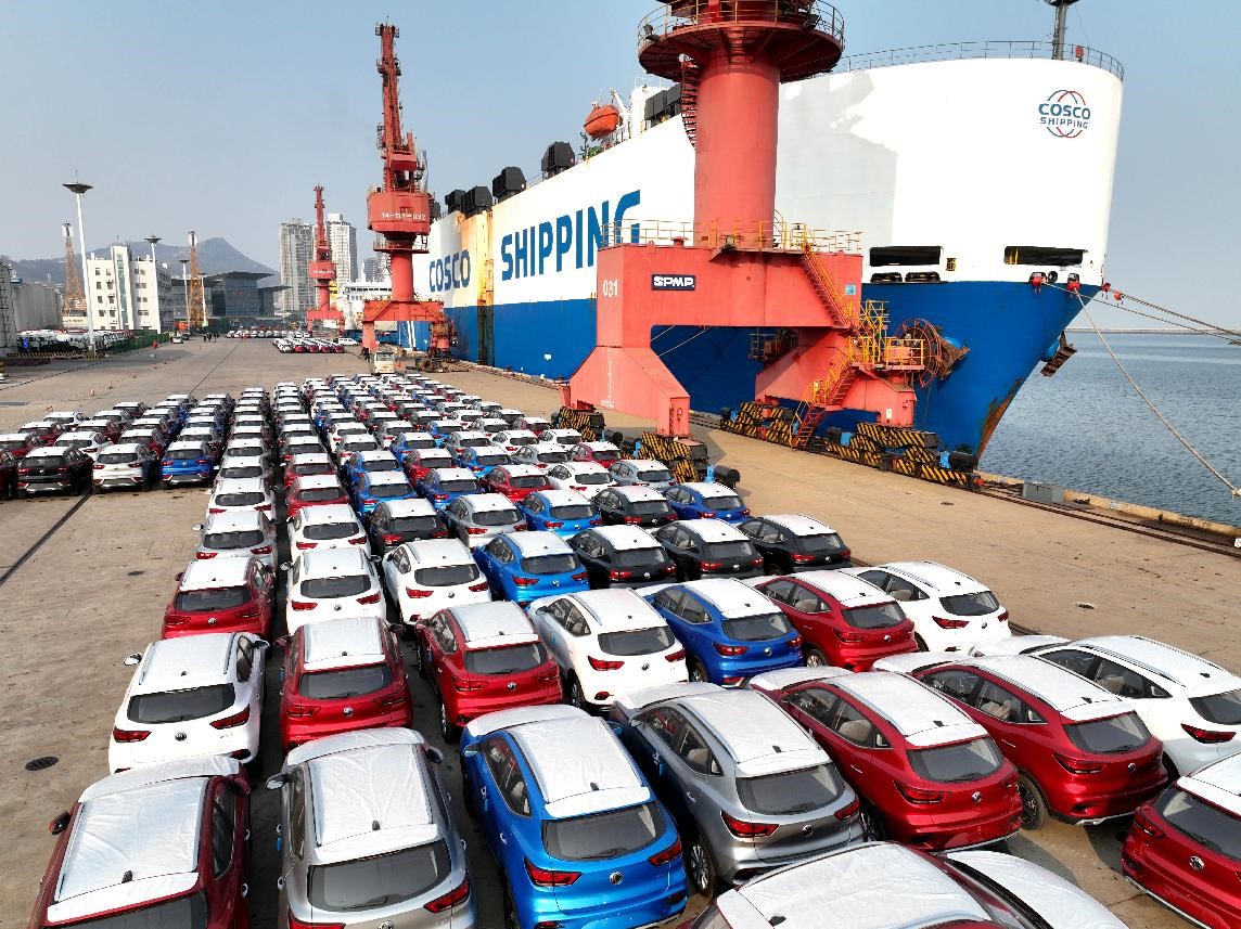 Vehicles are being loaded onto an oceangoing roll-on-roll-off ship for exportation at a terminal in Lianyungang, east China’s Jiangsu province, Jan. 3, 2022. (People’s Daily/Wang Chun)