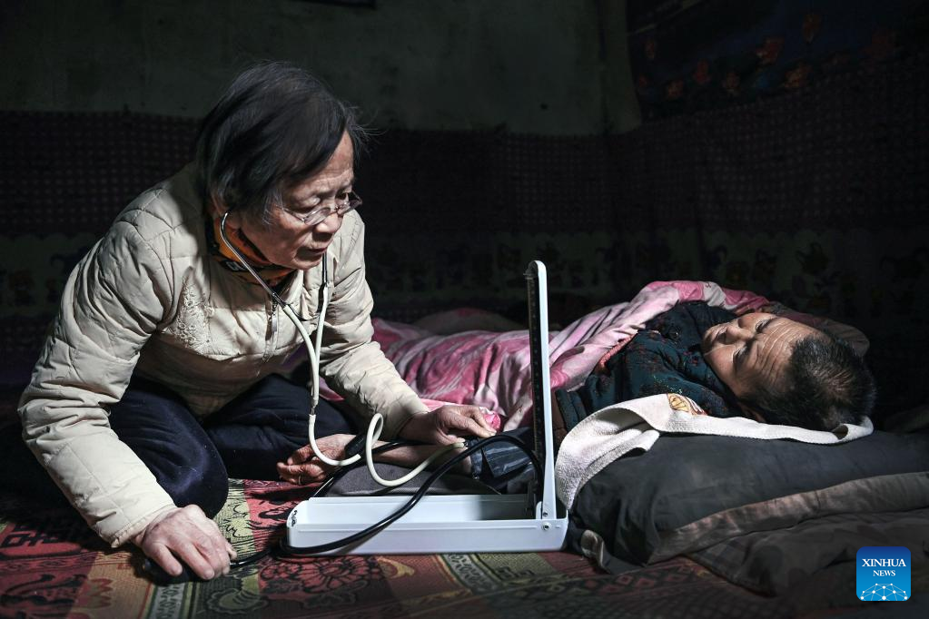 Lu Shengmei (L) performs a free medical treatment to villager Qiao Aifen, who is confined to bed due to paralysis inside her cave dwelling, in Hejiagou Village of Jiaxian County, Yulin City, northwest China's Shaanxi Province, Jan. 18, 2021. In the year of 1968, Lu graduated from a medical college in Beijing and chose to work in the remote Jiaxian. She had worked in the county until she got retired in 1999. Since then, she has kept offering free treatment to local people. (Xinhua/Tao Ming)