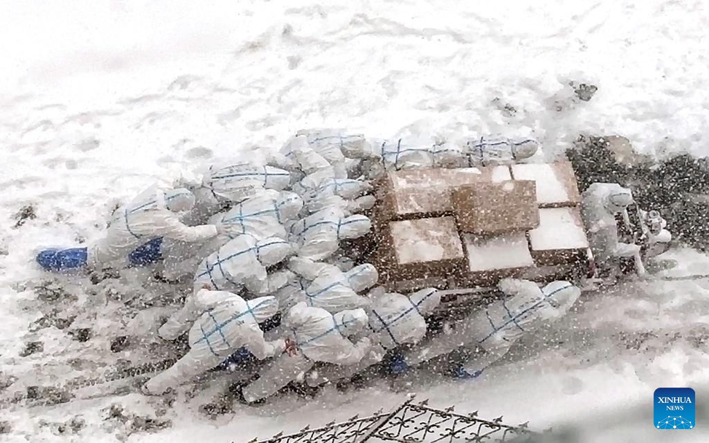 Volunteers push a tricycle on a slope to deliver daily necessities to students' dormitories on the campus of Dalian Ocean University under closed-off management for COVID-19 control, in Dalian, northeast China's Liaoning Province, Jan. 6, 2021. (Dalian Ocean University/Handout via Xinhua)