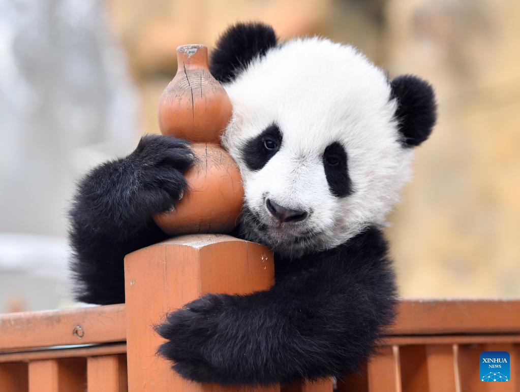A giant panda cub plays at Qinling Giant Panda Research Center in northwest China's Shaanxi Province, Jan. 22, 2021. (Xinhua/Zhang Bowen)