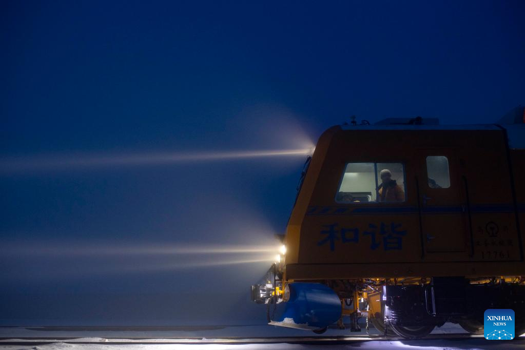 A snow removing machine, with workers on board, slowly pulls out of the garage of the Tiechanggou repairing team in Emin, northwest China's Xinjiang Uygur Autonomous Region, Jan. 21, 2021. Maytas, dubbed "Hell of Wind," is a wild area where the Karamay-Tacheng railway in Xinjiang runs through. It is also a place where the Tiechanggou repairing team under the China Railway Urumqi Bureau Group Co., Ltd. is on the watch 24 hours a day to ensure safe operation of all trains passing by. (Xinhua/Hu Huhu)