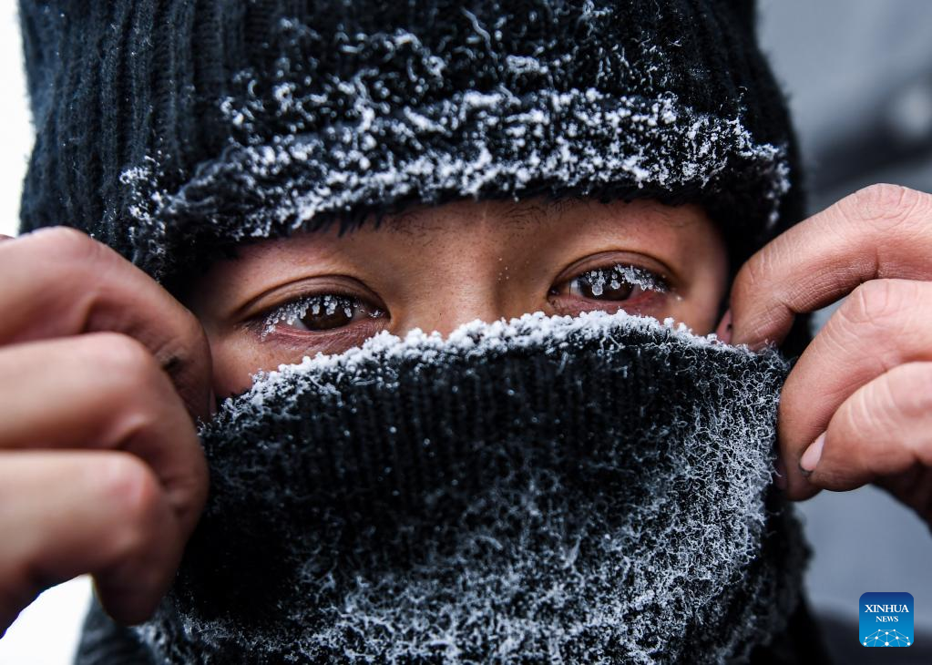 A train dispatcher works at the Xilinhot station in Xilinhot of Xilingol League, north China's Inner Mongolia Autonomous Region, Jan. 8, 2021. The lowest temperature reached minus 30 degrees Celsius in Xilinhot on the day. (Xinhua/Peng Yuan)