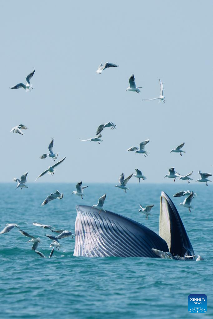 A Bryde's whale forages in waters off Weizhou Island in south China's Guangxi Zhuang Autonomous Region, Jan. 15, 2021. (Xinhua/Liu Jinhai)