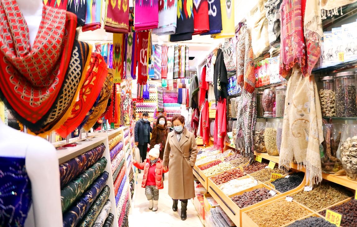 People shop at the Xinjiang International Grand Bazaar, northwest China’s Xinjiang Uygur autonomous region, Nov. 26, 2021. (People’s Daily Online/Zhang Xiuke)