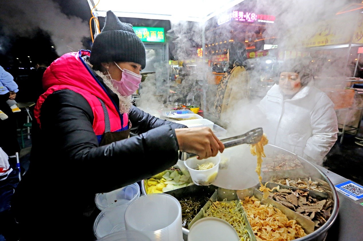 Photo taken on Nov. 25, 2021 shows a food stall in a night market in Yizhou district of Hami, northwest China's Xinjiang Uygur autonomous region. (People’s Daily Online/Cai Zengle)