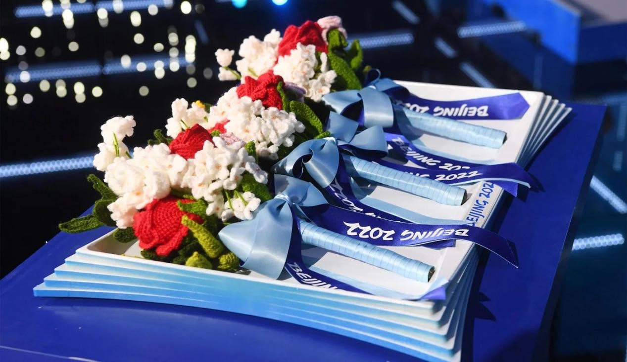 In an effort to put into practice the concept of delivering frugal and sustainable Olympic and Paralympic Games, the Beijing 2022 will present hand-knitted bouquets to the medalists. The bouquet for winners at the Olympic Winter Games includes six types of flowers, namely rose, Chinese rose, lily of the valley, hydrangea, laurel and olive, which symbolize friendship, tenacity, happiness, unity, victory and peace, respectively. The color of the silk ribbon for the bouquet is blue from the Beijing 2022 color scheme, a symbol of winter sports.