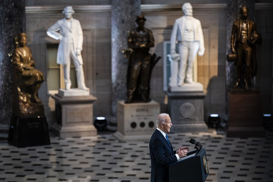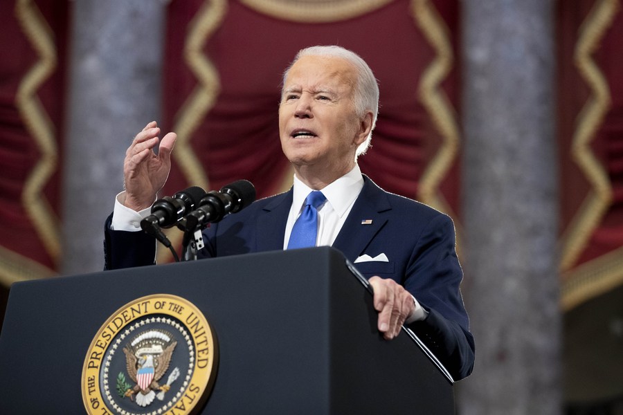 U.S. President Joe Biden delivers a speech to mark the anniversary of the Jan. 6 attack on the Capitol at the Statuary Hall in the U.S. Capitol building in Washington, D.C., the United States, Jan. 6, 2022. (Jabin Botsford/Pool via Xinhua)