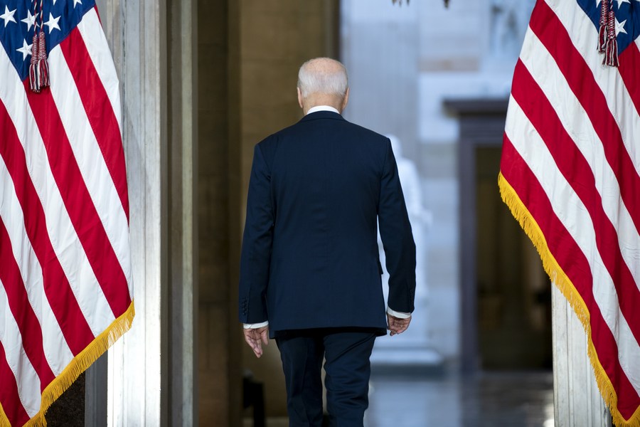 U.S. President Joe Biden leaves after delivering a speech to mark the anniversary of the Jan. 6 attack on the Capitol at the Statuary Hall in the U.S. Capitol building in Washington, D.C., the United States, Jan. 6, 2022. (Greg Nash/Pool via Xinhua)