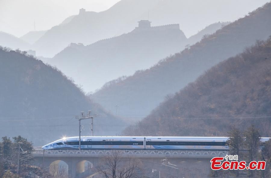 A smart high-speed train runs bypass the Juyongguan Pass Section of the Great Wall in Beijing, Jan. 6, 2022. (Photo: China News Service/Jia Tianyong)