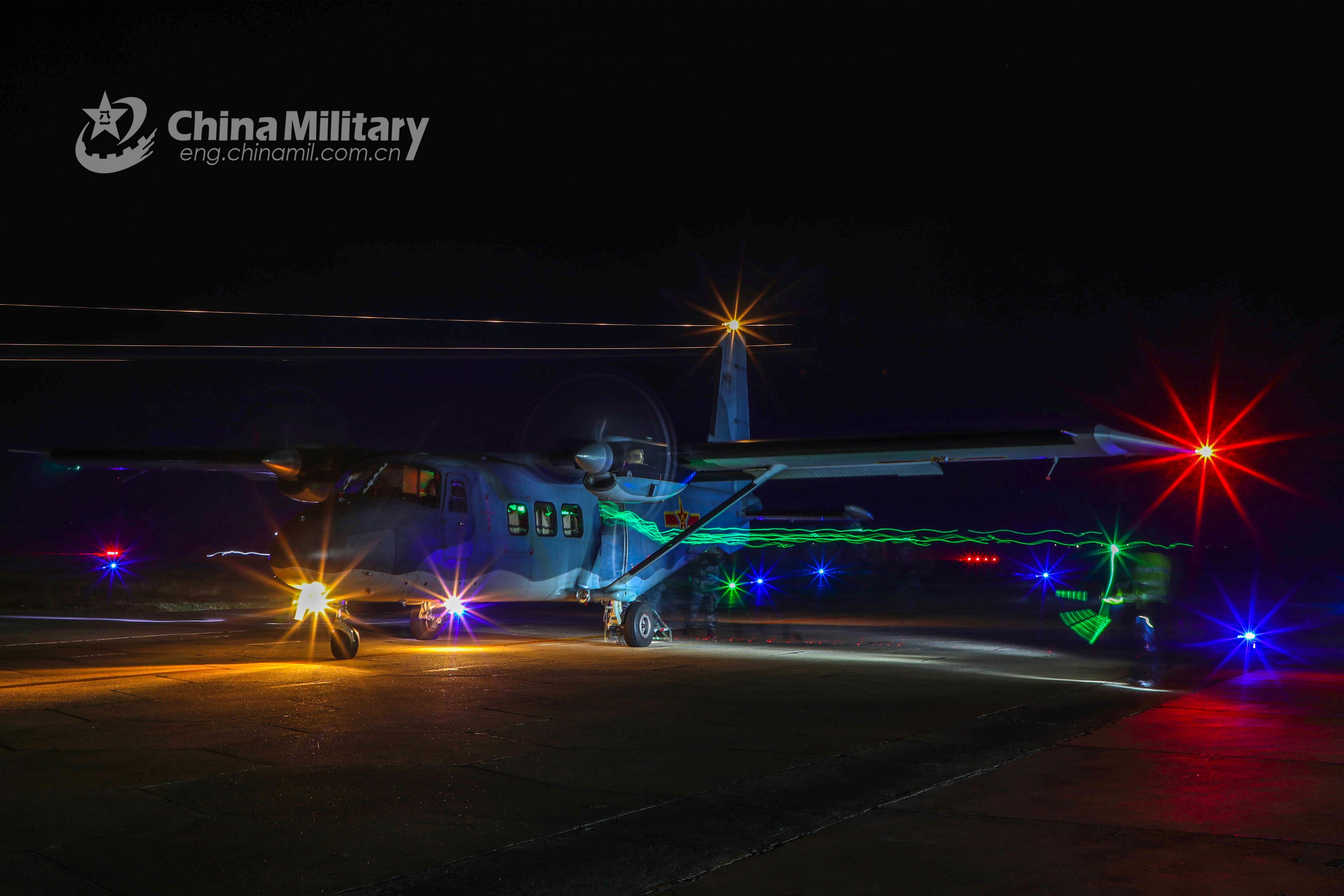 Airmen recruits assigned to an airborne brigade under the PLA Air Force board a transport aircraft in order during a night airborne training exercise in late December, 2021. (eng.chinamil.com.cn/Photo by Sheng Chao)