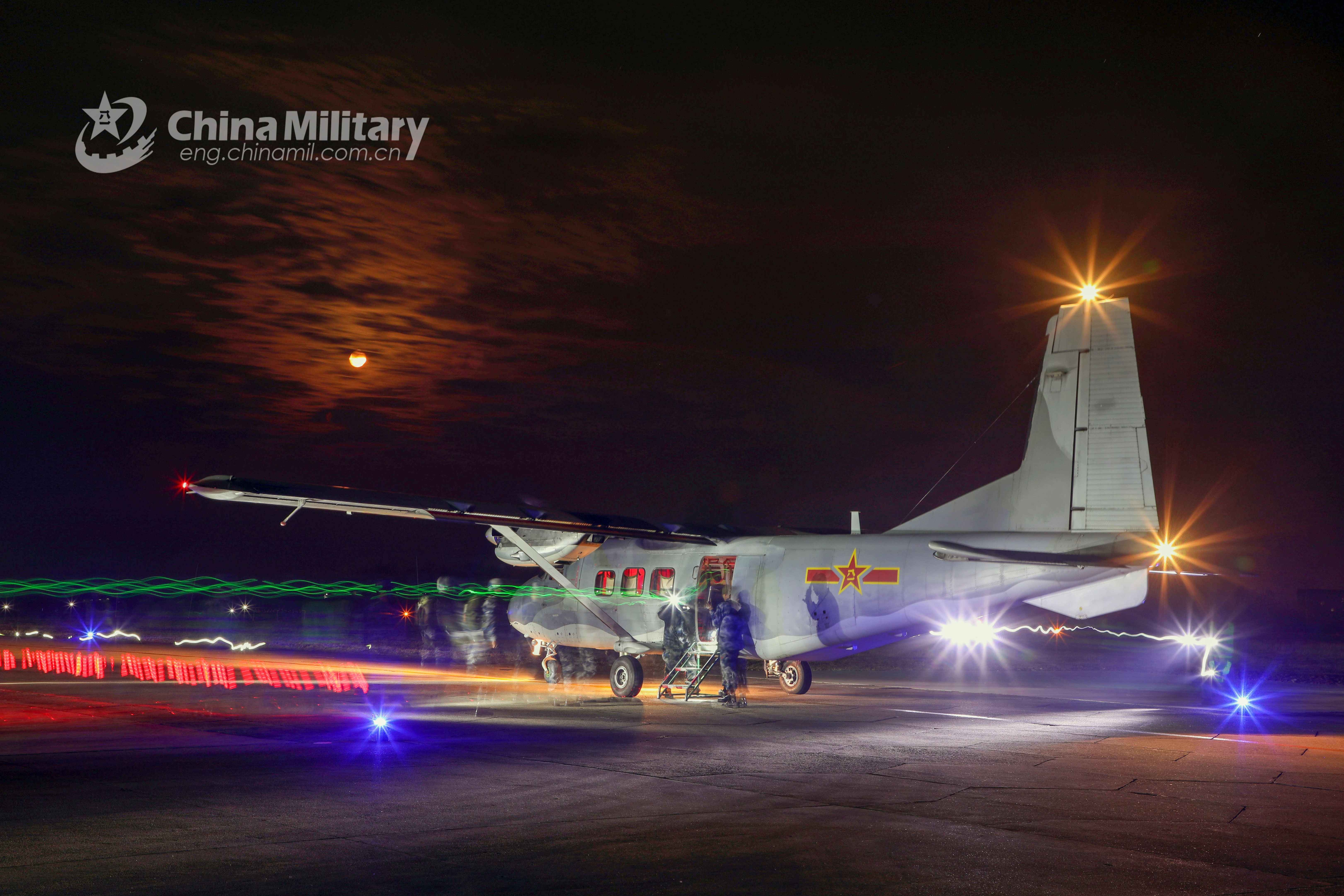 Airmen recruits assigned to an airborne brigade under the PLA Air Force board a transport aircraft in order during a night airborne training exercise in late December, 2021. (eng.chinamil.com.cn/Photo by Sheng Chao)