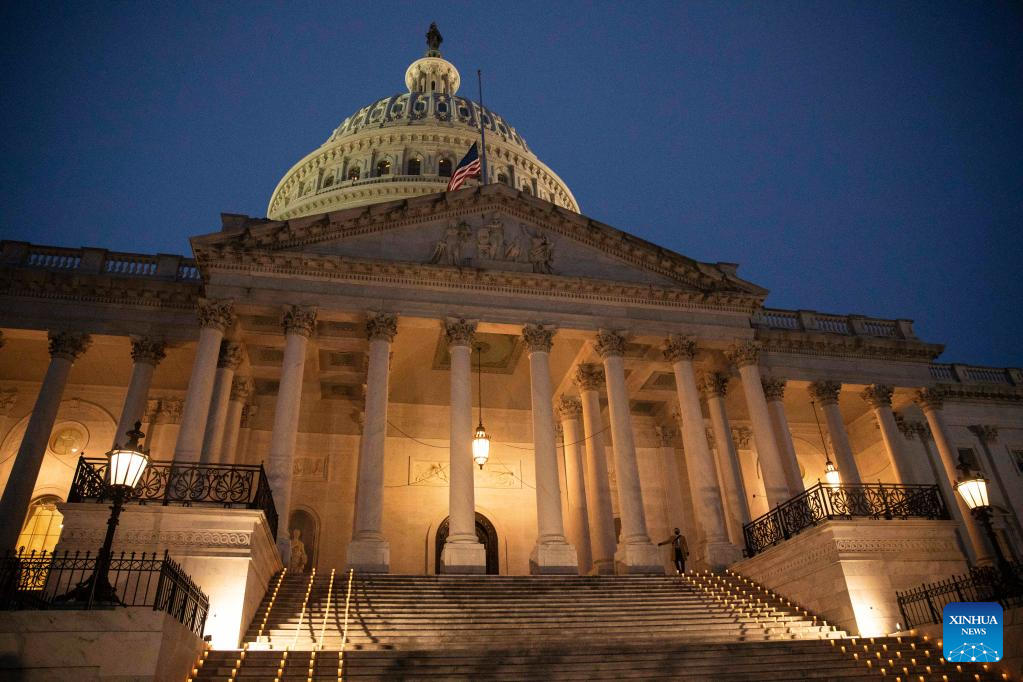 A U.S. national flag flies at half-staff and candles are lit at the U.S. Capitol Building to mark the anniversary of the Jan. 6 attack on the Capitol in Washington, D.C., the United States, Jan. 6, 2022. (Photo by Aaron Schwartz/Xinhua)