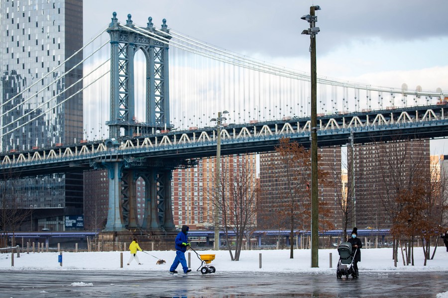 A worker salts a plaza at Brooklyn Bridge Park in Brooklyn, New York, the United States, on Jan. 7, 2022. (Photo by Michael Nagle/Xinhua)