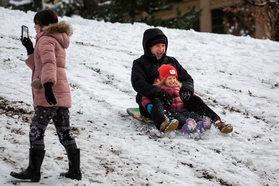 People sled in Dumbo, Brooklyn, New York, the United States, on Jan. 7, 2022. (Photo by Michael Nagle/Xinhua)