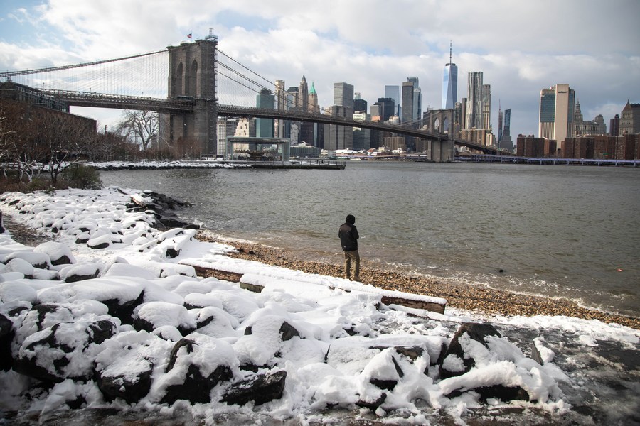 A person stands by the waterfront in Dumbo, Brooklyn, New York, the United States, on Jan. 7, 2022. (Photo by Michael Nagle/Xinhua)