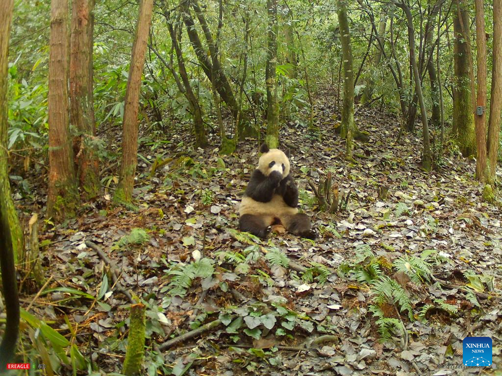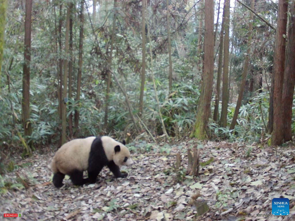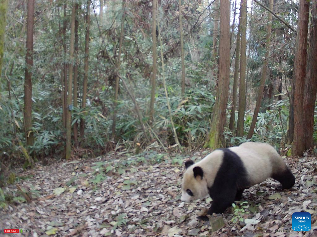Photo taken by an infrared camera on Nov. 23, 2021 shows a giant panda named Xiaohetao in the wild. Xiaohetao was released into the Longxi-Hongkou National Nature Reserve, a habitat for wild pandas, in Dujiangyan, southwest China's Sichuan Province in December, 2018.