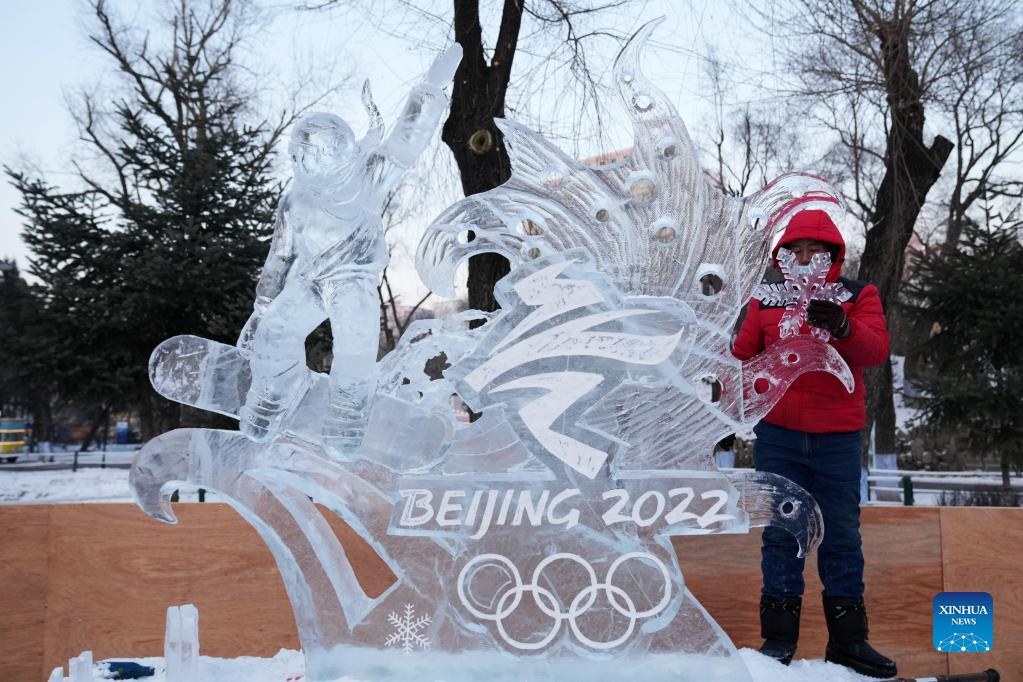 Sculptors take part in the 41th national professional ice sculpture competition in Harbin, northeast China's Heilongjiang Province, Jan. 7, 2022. The competition, featuring 2022 Winter Olympic Games, has attracted 60 sculptors all over the country. (Xinhua/Wang Jianwei)