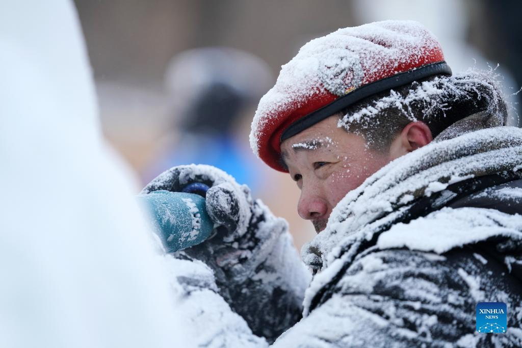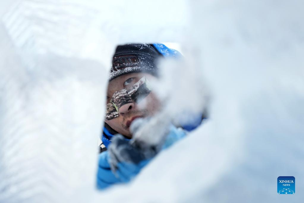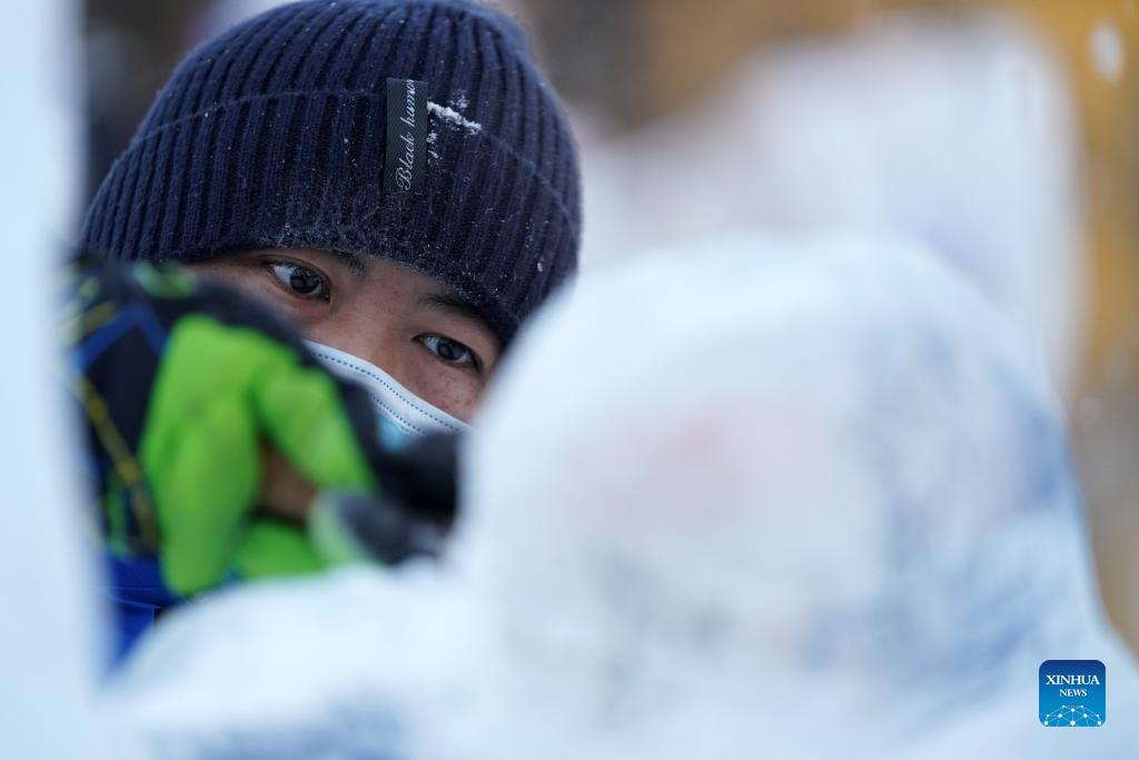 A sculptor takes part in the 41th national professional ice sculpture competition in Harbin, northeast China's Heilongjiang Province, Jan. 7, 2022. The competition, featuring 2022 Winter Olympic Games, has attracted 60 sculptors all over the country. (Xinhua/Wang Jianwei)