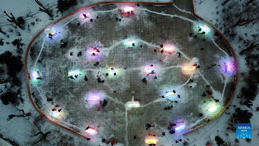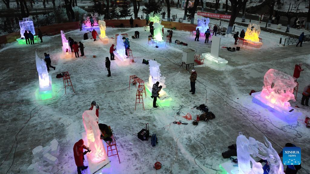 Aerial photo shows sculptors taking part in the 41th national professional ice sculpture competition in Harbin, northeast China's Heilongjiang Province, Jan. 7, 2022. The competition, featuring 2022 Winter Olympic Games, has attracted 60 sculptors all over the country. (Xinhua/Wang Jianwei)