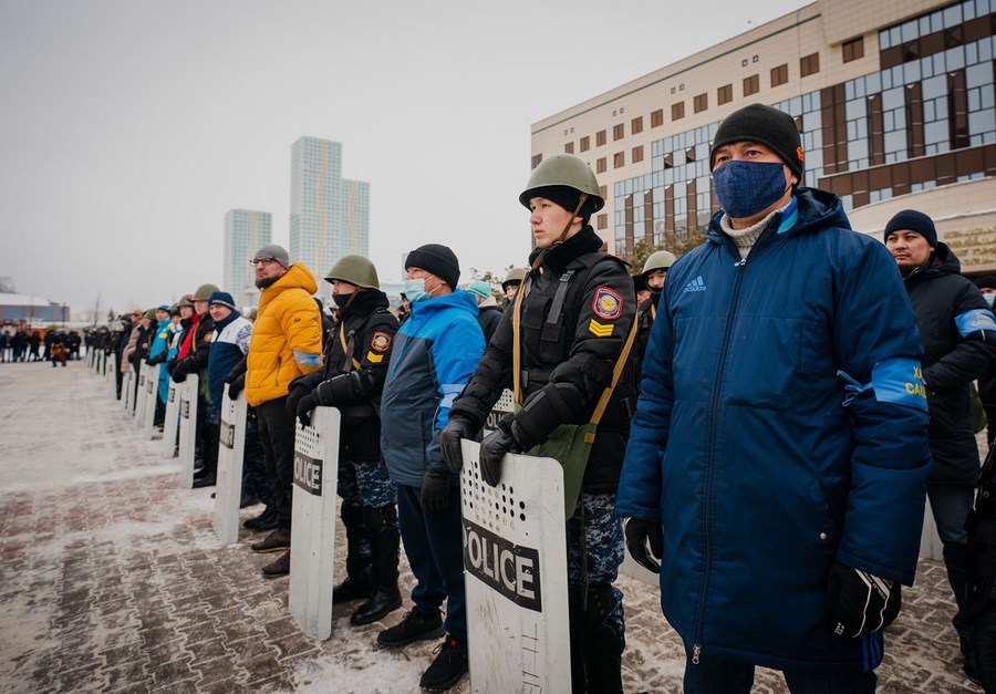 Local residents stand shoulder to shoulder with police officers in Nur-Sultan, Kazakhstan, Jan. 8, 2022. (Website of Nur-sultan city hall/Handout via Xinhua)