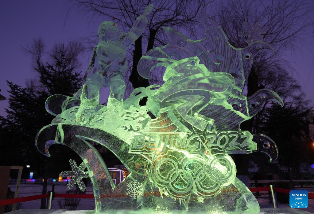 Photo taken on Jan. 8, 2022 shows ice sculptures during the 41st national professional ice sculpture competition in Harbin, northeast China's Heilongjiang Province. The competition, featuring 2022 Winter Olympic Games, concluded here Saturday. About 60 sculptors participated in the 3-day competition. (Xinhua/Wang Jianwei)
