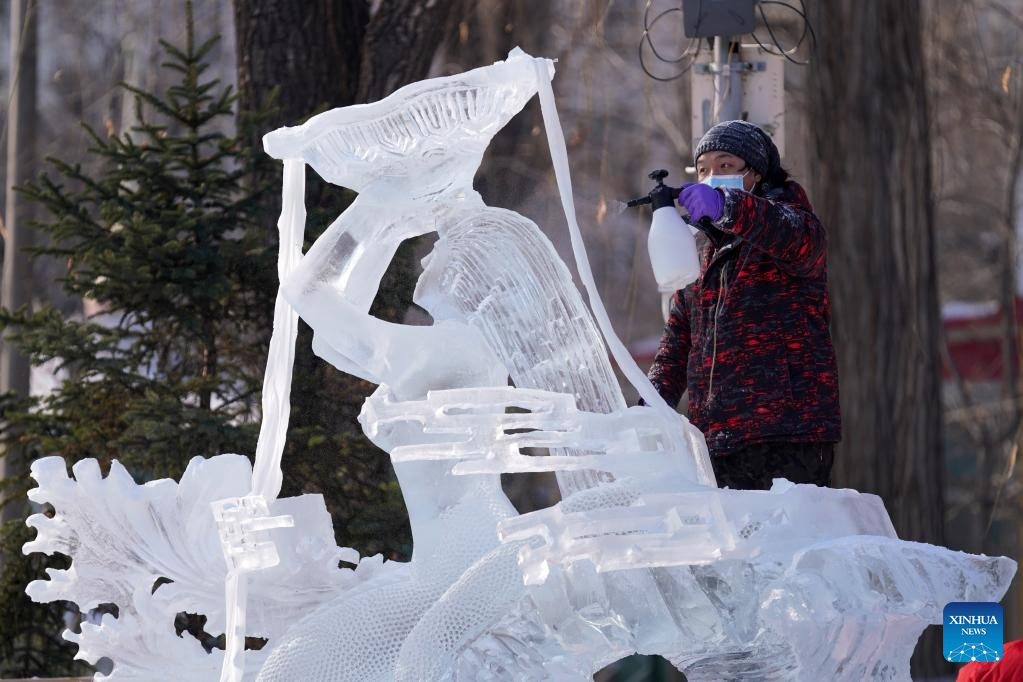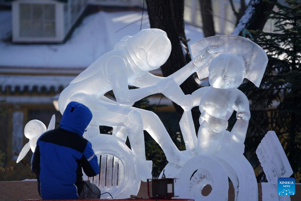 A sculptor works on an ice sculpture which won the bronze award during the 41st national professional ice sculpture competition in Harbin, northeast China's Heilongjiang Province, Jan. 8, 2022. The competition, featuring 2022 Winter Olympic Games, concluded here Saturday. About 60 sculptors participated in the 3-day competition. (Xinhua/Wang Jianwei)