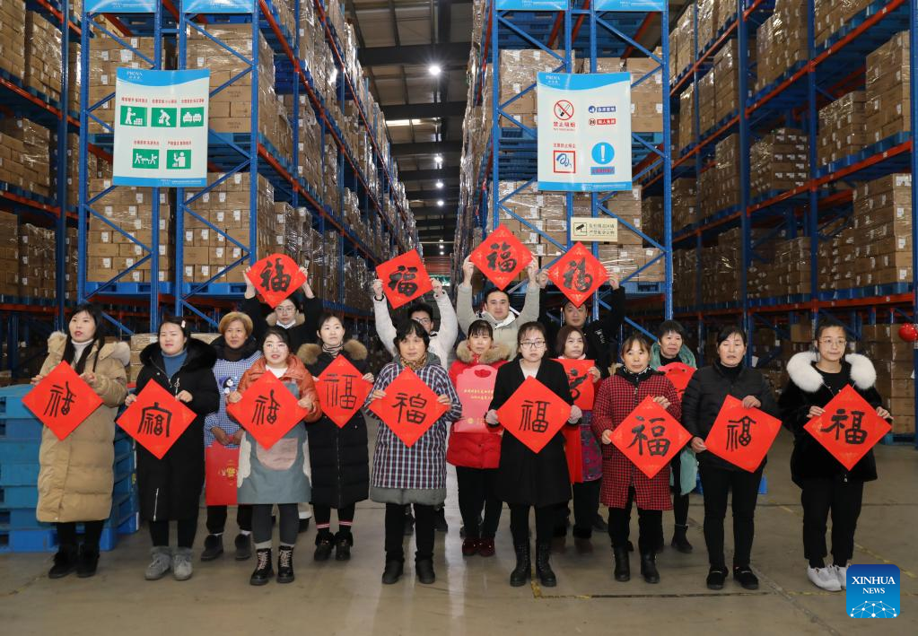 Workers pose for group photos with Chinese character "Fu", which means "good fortune", at a cosmetics company in Wuxing District of Huzhou, east China's Zhejiang Province, Jan. 8, 2022. The labour union of Wuxing District in Huzhou lately organized a series of activities for migrant workers as the Spring Festival is drawing near. (Photo by He Weiwei/Xinhua)