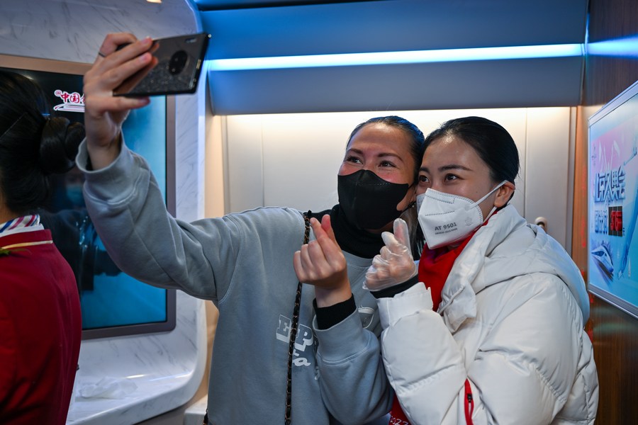 Wu Yifan (R) poses for selfies with a passenger on train G8811 on Dec. 30, 2021. (Xinhua/Liu Jinhai)