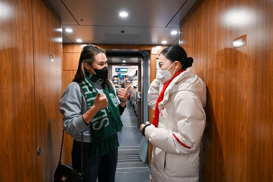 Wu Yifan (R) talks to a foreign passenger on the train G8811 on Dec. 30, 2021. (Xinhua/Liu Jinhai)