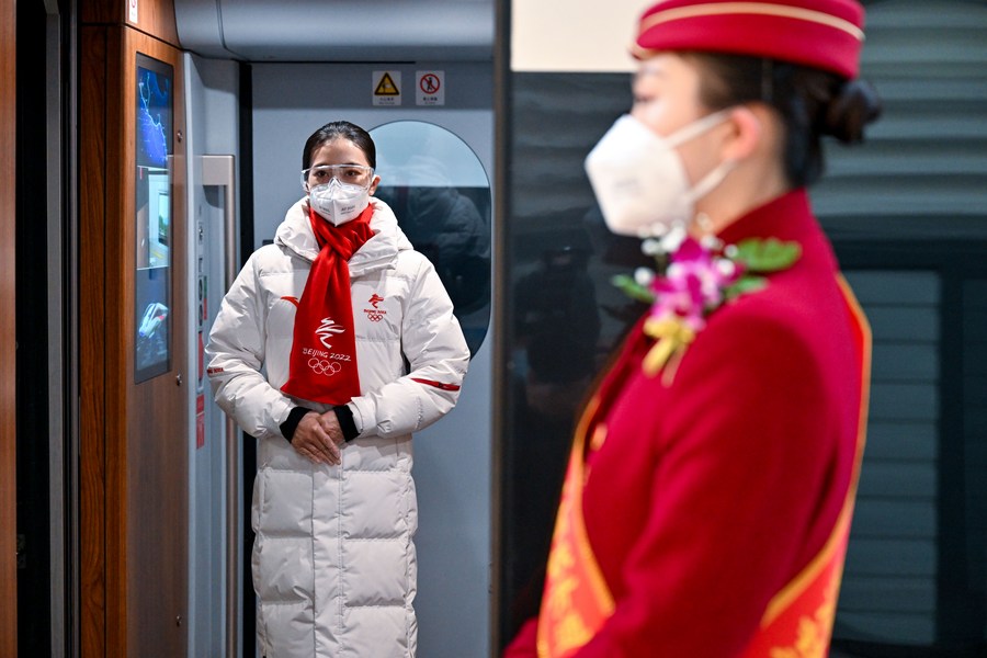 BEIJING, Jan. 8 (Xinhua) -- Wu Yifan, 26, is a conductor of the Xuezhimeng (snow dream) crew team on a tailor-made bullet train along the high-speed railway linking Beijing and Zhangjiakou, the co-host city of the Beijing Winter Olympic Games.