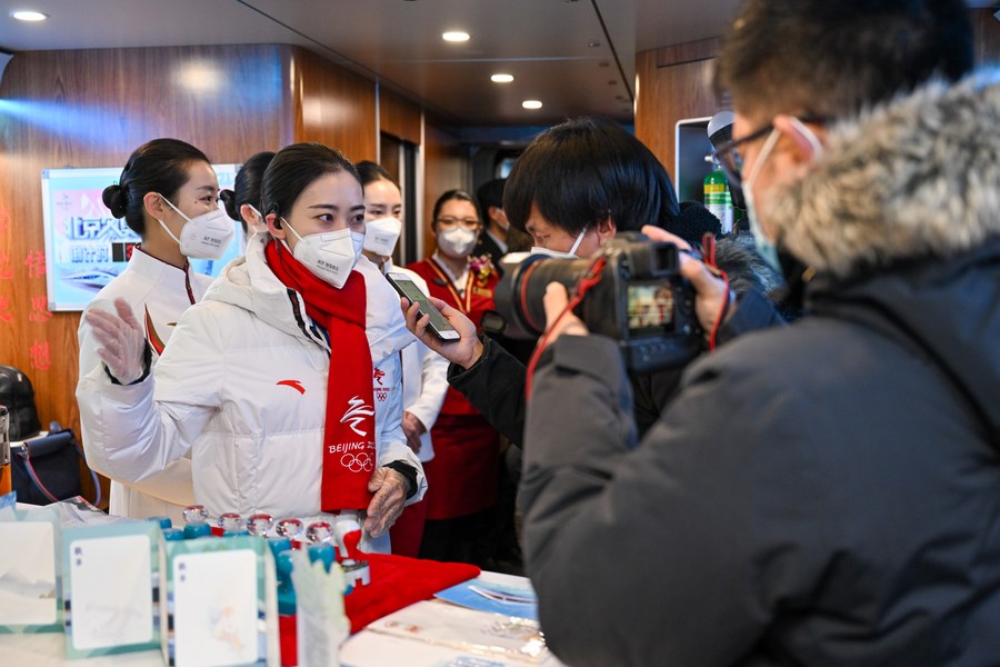 Wu Yifan (2nd L) speaks in an interview on the train G8811 on Dec. 30, 2021. (Xinhua/Huang Zhen)