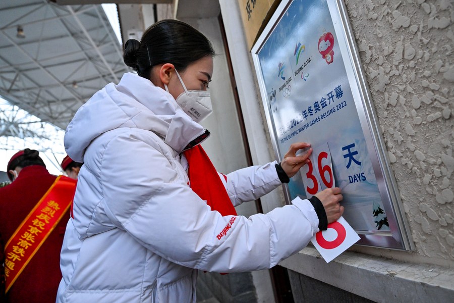 Wu Yifan changes the count-down board of the 2022 Beijing Olympic Winter Games outside her dormitory on Dec. 30, 2021. (Xinhua/Liu Jinhai)