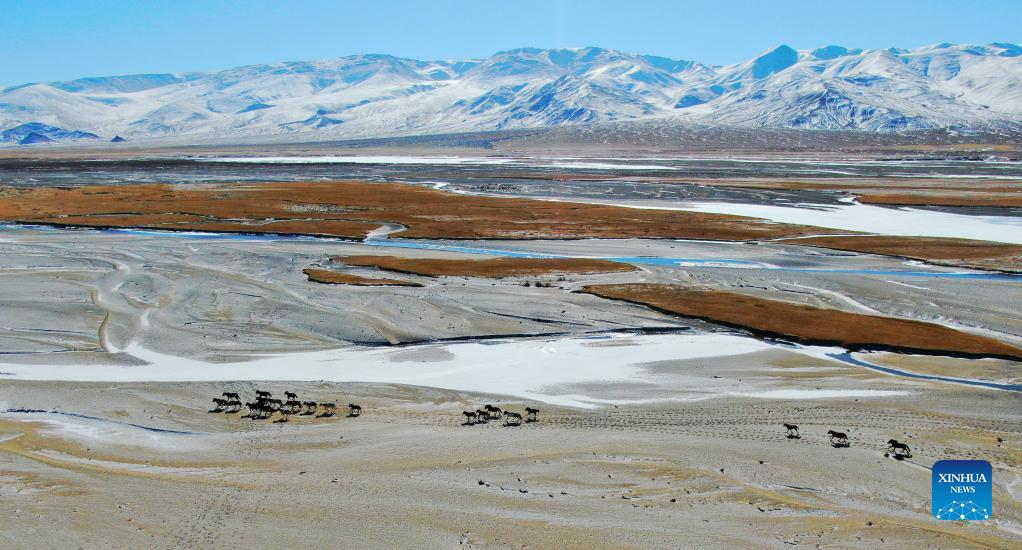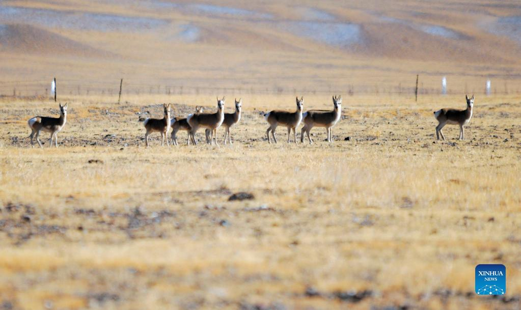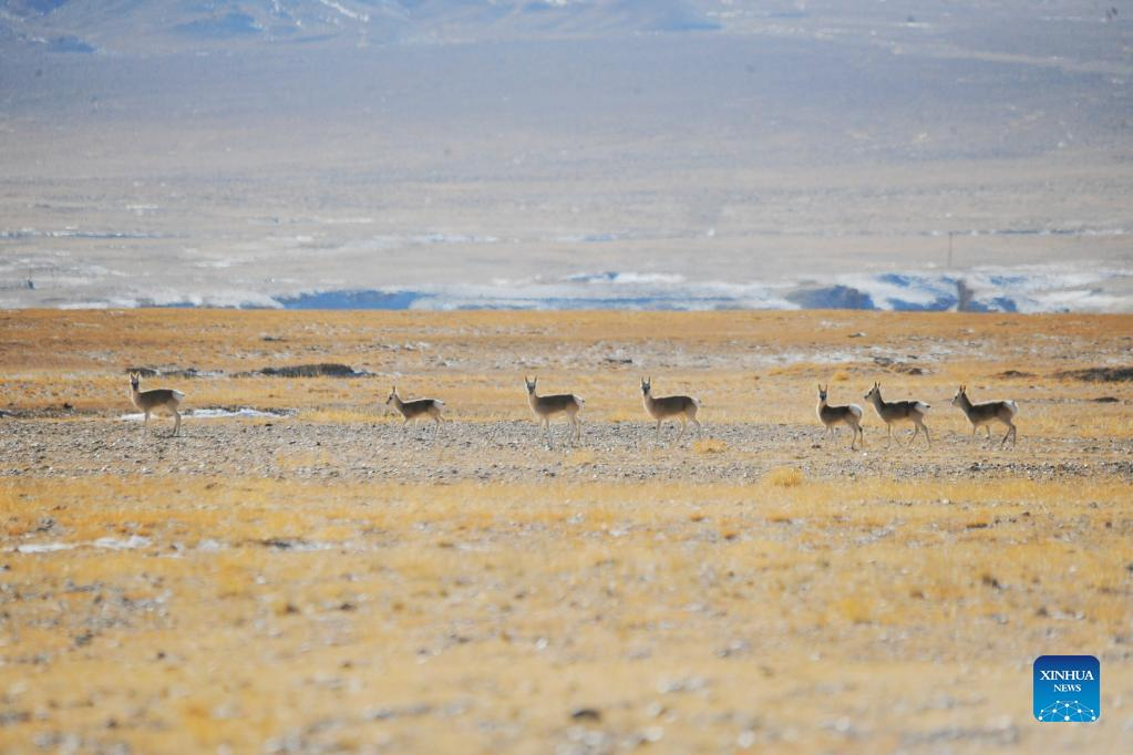 Tibetan gazelles are seen on the Haltent grassland in the Kazak Autonomous County of Aksay, northwest China's Gansu Province, Jan. 8, 2022. (Photo by Ma Xiaowei/Xinhua)