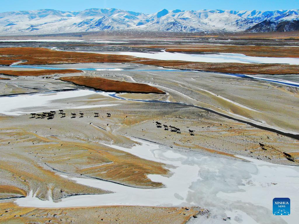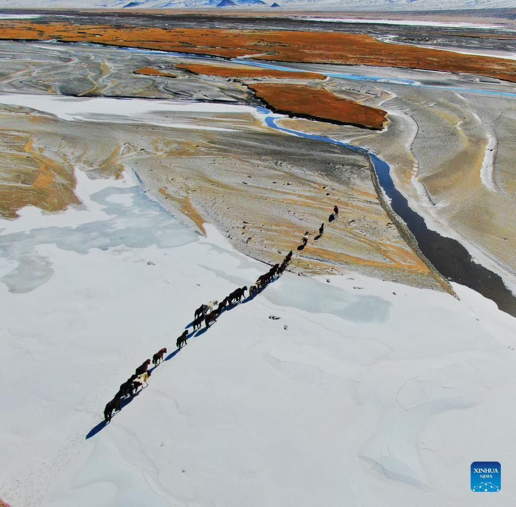 Aerial photo shows horses running on the Haltent grassland in the Kazak Autonomous County of Aksay, northwest China's Gansu Province, Jan. 8, 2022. (Photo by Ma Xiaowei/Xinhua)