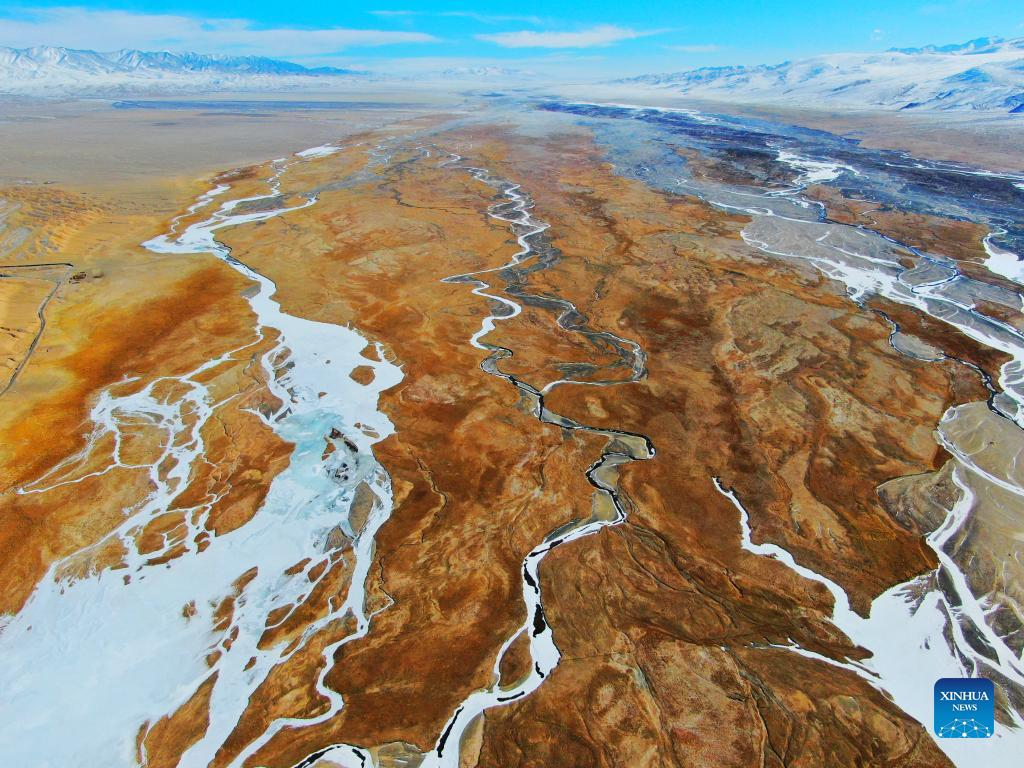 Aerial photo shows the winter scenery of the Haltent grassland in the Kazak Autonomous County of Aksay, northwest China's Gansu Province, Jan. 8, 2022. (Photo by Ma Xiaowei/Xinhua)