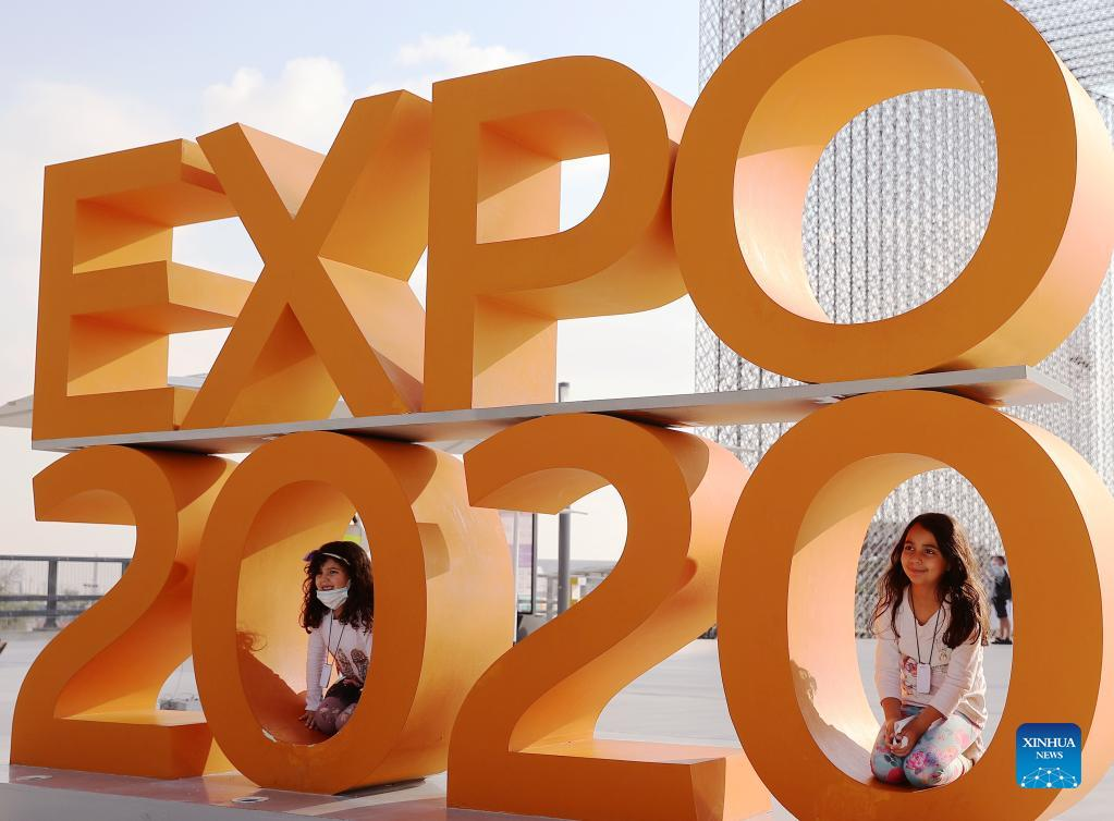 Children pose for photos at the entrance of the Expo 2020 Dubai in Dubai, the United Arab Emirates, on Jan. 9, 2022. As night falls on Expo 2020 Dubai, everything is just getting more fantastic. The cool breeze caresses the faces of visitors, healing them from a day of fatigue and breathing refreshing joviality into them. According to official data, Expo 2020 Dubai recorded 8,958,132 visits from Oct. 1 to Dec. 31, 2021. (Xinhua/Wang Dongzhen)