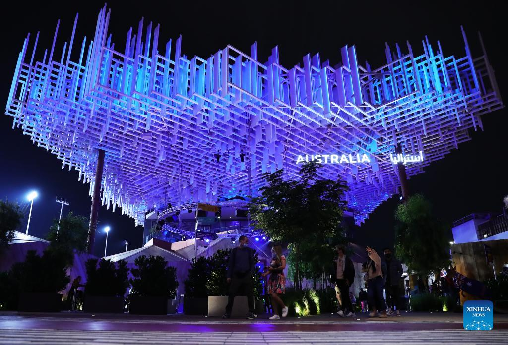 People walk past the Australia Pavilion of the Expo 2020 Dubai in Dubai, the United Arab Emirates, on Jan. 9, 2022. As night falls on Expo 2020 Dubai, everything is just getting more fantastic. The cool breeze caresses the faces of visitors, healing them from a day of fatigue and breathing refreshing joviality into them. According to official data, Expo 2020 Dubai recorded 8,958,132 visits from Oct. 1 to Dec. 31, 2021. (Xinhua/Wang Dongzhen)