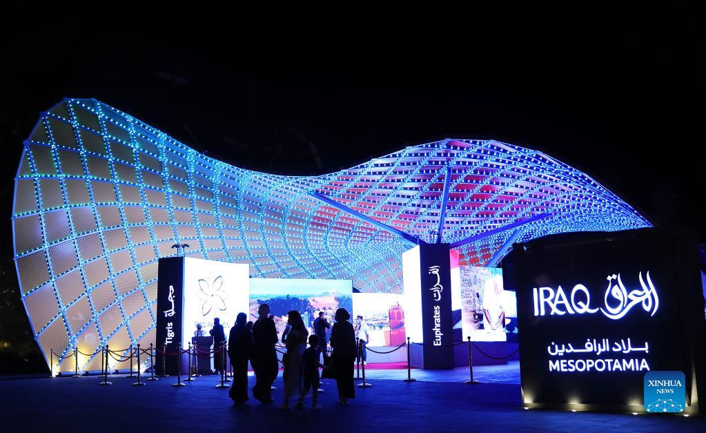 People visit the Iraq Pavilion of the Expo 2020 Dubai in Dubai, the United Arab Emirates, on Jan. 9, 2022. As night falls on Expo 2020 Dubai, everything is just getting more fantastic. The cool breeze caresses the faces of visitors, healing them from a day of fatigue and breathing refreshing joviality into them. According to official data, Expo 2020 Dubai recorded 8,958,132 visits from Oct. 1 to Dec. 31, 2021. (Xinhua/Wang Dongzhen)