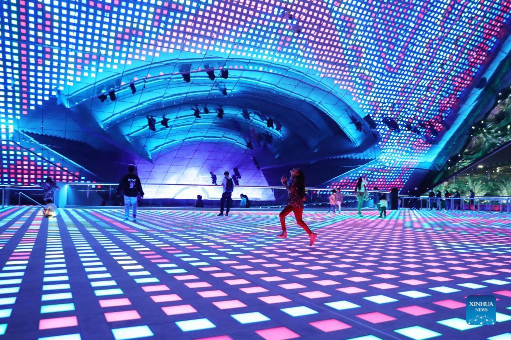Visitors enjoy themselves outside the Saudi Arabia Pavilion of the Expo 2020 Dubai in Dubai, the United Arab Emirates, on Jan. 9, 2022. As night falls on Expo 2020 Dubai, everything is just getting more fantastic. The cool breeze caresses the faces of visitors, healing them from a day of fatigue and breathing refreshing joviality into them. According to official data, Expo 2020 Dubai recorded 8,958,132 visits from Oct. 1 to Dec. 31, 2021. (Xinhua/Wang Dongzhen)
