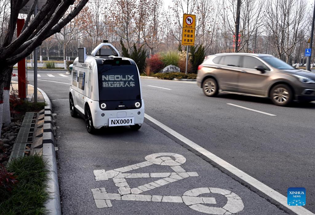 An unmanned delivery vehicle runs on a bicycle lane in Xi'an, capital of northwest China's Shaanxi Province, Jan. 9, 2022. The driverless vehicle is designed to transport goods with a maximum weight of 320 kg per trip. It can traverse 6.5 km through the lanes on roads on a single trip. (Xinhua/Tao Ming)
